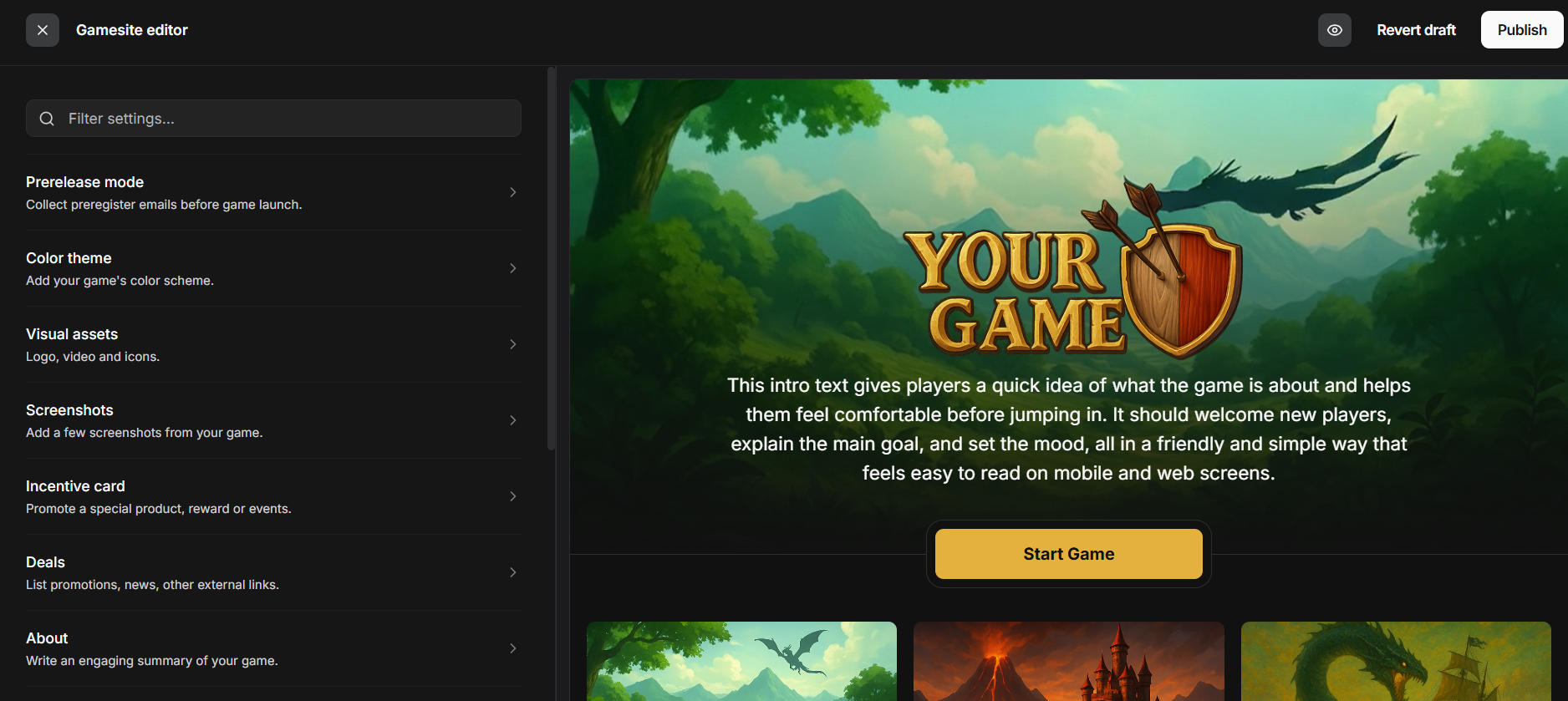 Configure the visuals, images, texts, and links of your Pley Gamsite in the Game Manager.
