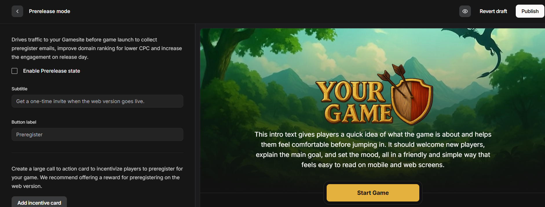 - Go to the Game Manager > Distribution > Gamesite. Enable Prerelease mode.