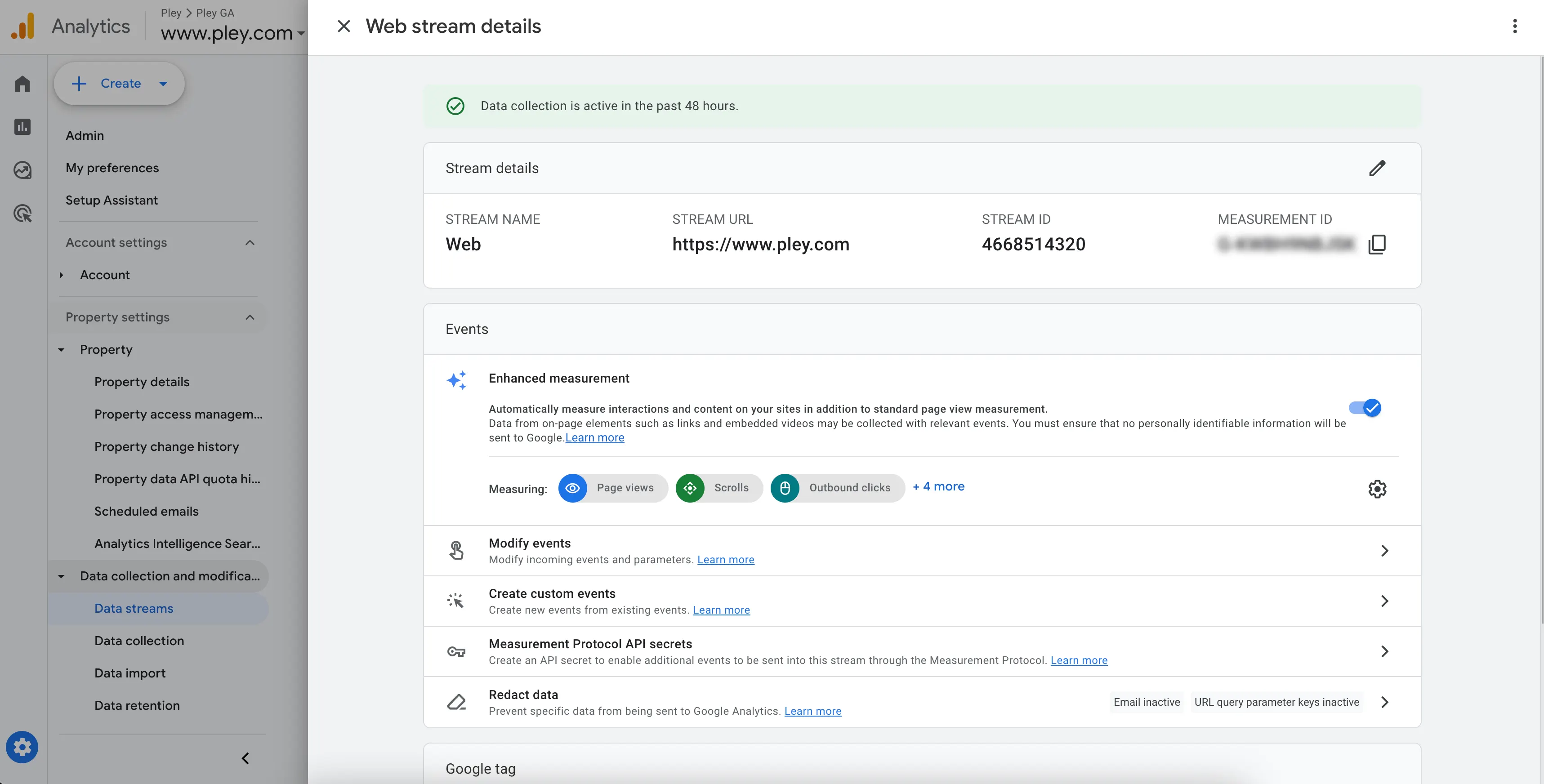 You’ll find the GA4 measurement ID in Admin → Data streams → Web in your Google Analytics account. It should look like G-XXXXXXXXXX and you should enter it for both GA4 Measurement ID and Google Tag variables.