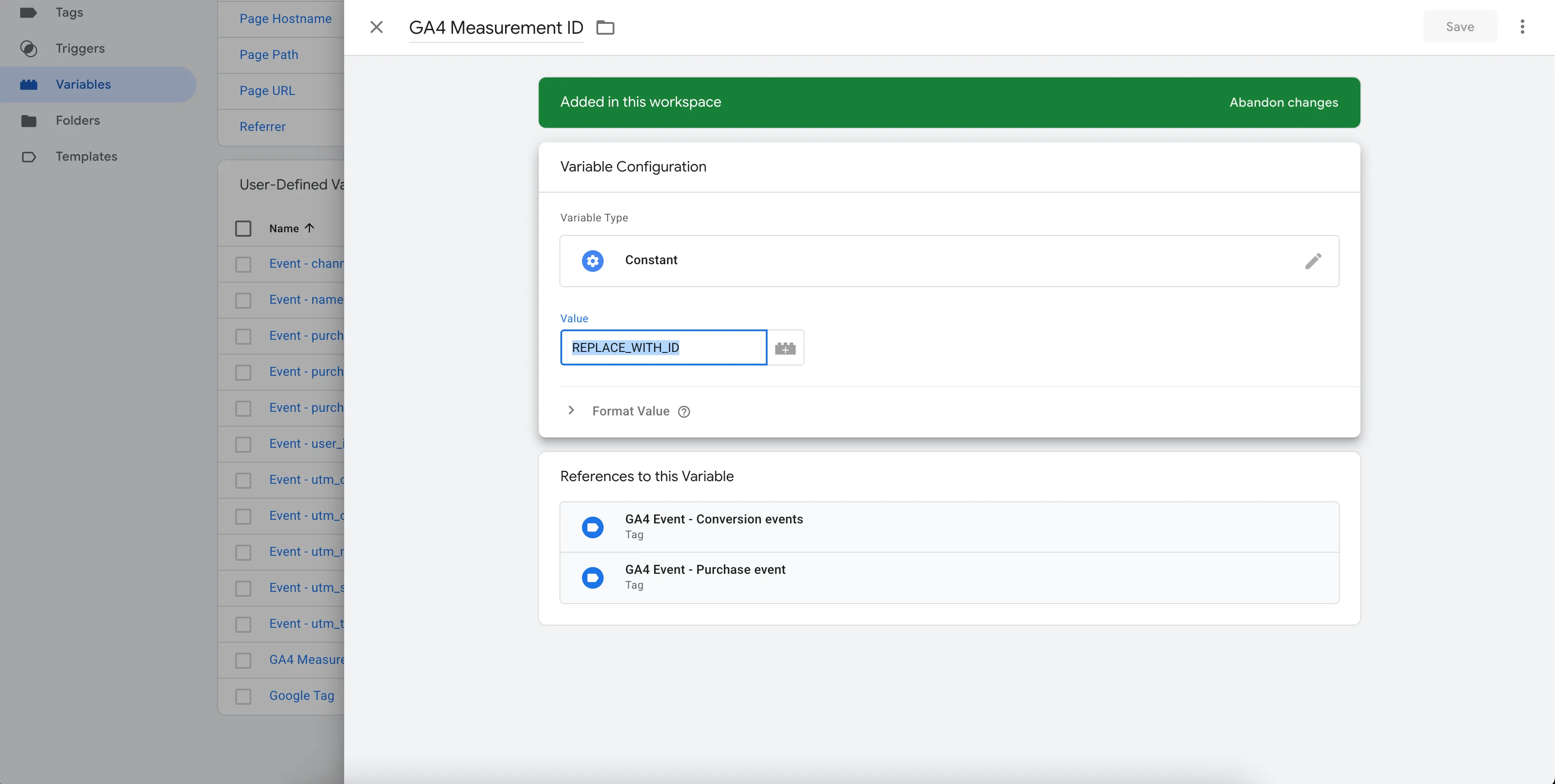In your container, navigate to Variables and update the GA4 Measurement ID (if you’re using Google Analytics) as well as the Google Tag. These IDs are used in the tags to communicate with Google Analytics and Google Ads.