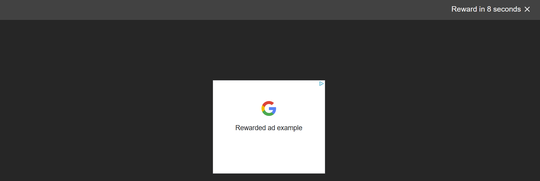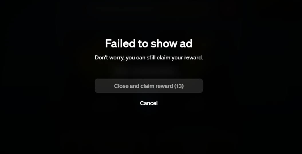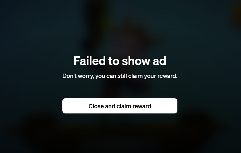- Ad blocker prevents the ad script completely, causing the "Failed to show ad" screen. Players are prompted to wait 15 seconds, and then claim their reward.